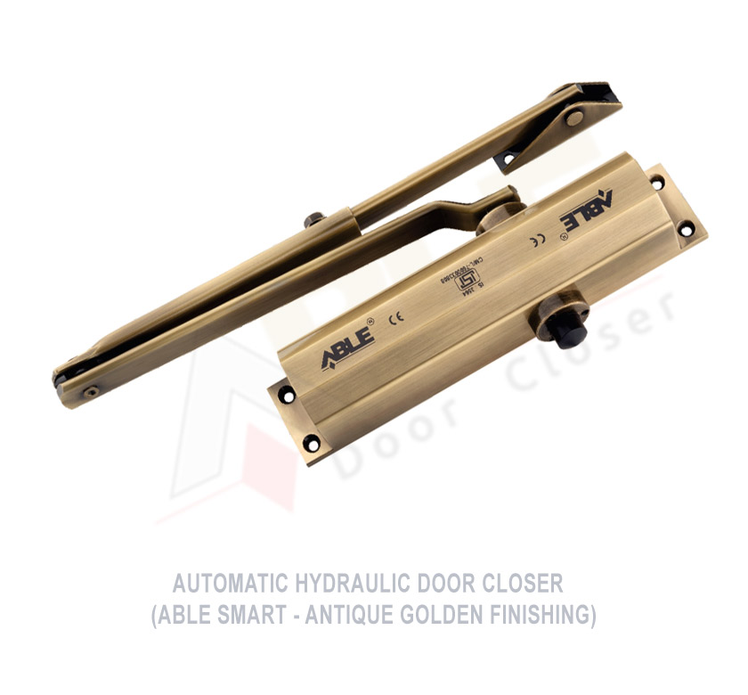 Amrut Industries Door Closer Manufacture & Suppliers Wide Range of ABLE BRAND Antique Design Golden Hydraulic Door Closer, Aluminiume Body Self Closed Device Door Closer, (Pricise CNC Door Closer Machining). Our Brand Available Products in Four Colors Aluminiume Body for Silver, Golden, Black & Brown. our Installation System Work & Manufacturing at Rajkot Gujarat India.